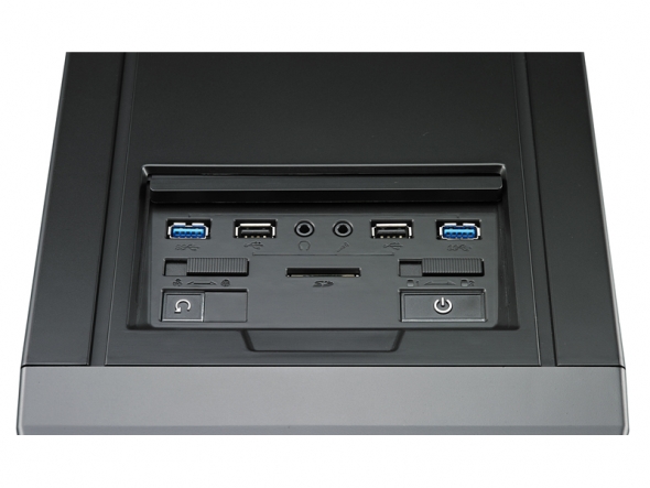 Vrchný panel skrinky je celý vyrobený z čierneho plastu a umiestnený je na ňom predovšetkým veľmi bohato vybavený I/O panel, ktorý možno chrániť pomocou zasúvacích dvierok. Tento panel obsahuje tlačítko Reset a Power, porty a konektory (2x USB 3.0, 2x USB 2.0 a audio pre mikrofón a slúchadlá). Nachádza sa tu aj veľmi užitočná čítačka kariet Secure Digital (SD), jeden regulátor otáčok ventilátorov (posuvník dole) a taktiež prepínač systému Dual HDD Boot Controller. Ten dáva užívateľovi na výber medzi dvoma pevnými diskami, z ktorého je možné následne bootovat. Funguje jednoducho tak, že jeden disk zapne a druhý zároveň vypne. Nie je vhodné preto medzi jednotlivými diskami prepínať pri zapnutom počítači. Táto funkcia prichádza veľmi vhod pre tých, ktorí by radi prepínali (resp. bootovali) buď do OS Windows 7 alebo novšieho a modernejšieho OS Windows 8 ktorý možno ovládať dotykmi.